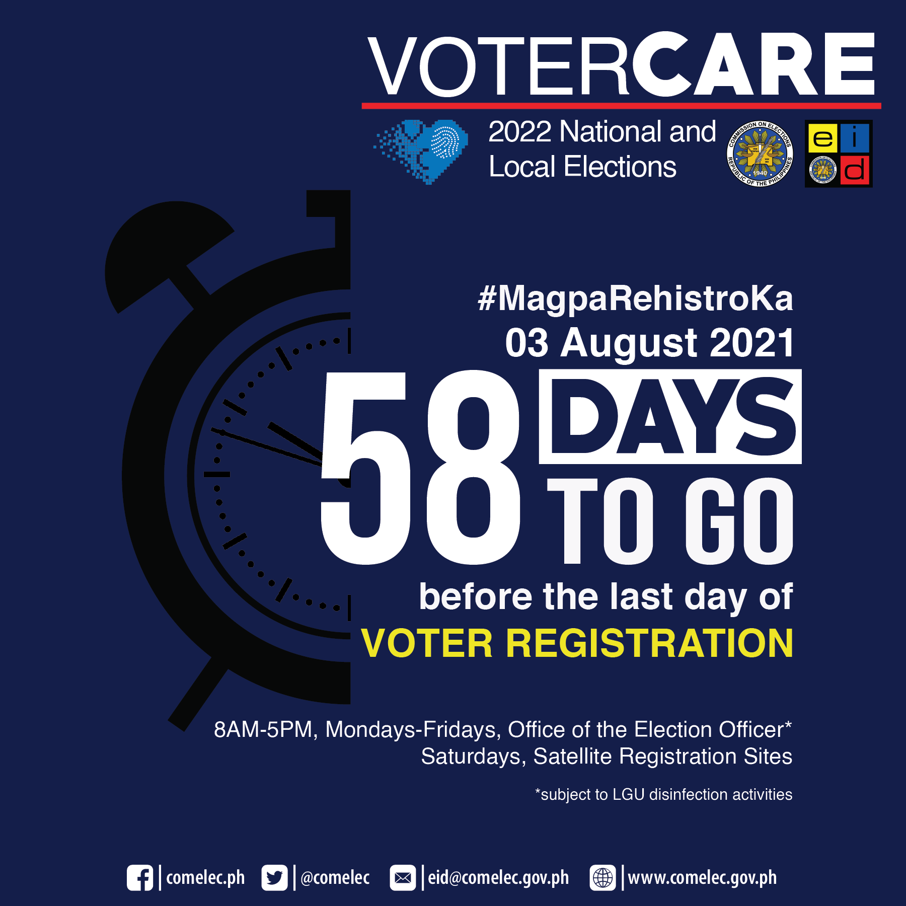 Comelec On Twitter Today Is 3 August 2021 And It Is 58 Days Before The Last Day Of Voter Registration Magparehistroka Na Votercare Nle2022 Voterreg2021countdown Https T Co Eczrg0tonq